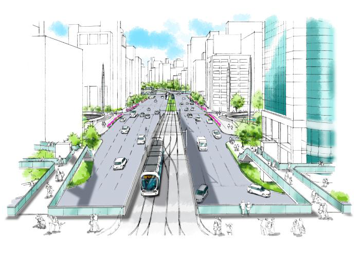 再整備の基本方針では路面電車、バス、タクシーの必要規模確保を優先。路面電車については駅前大橋ルートとし、併せて循環ルートを整備することにしました。